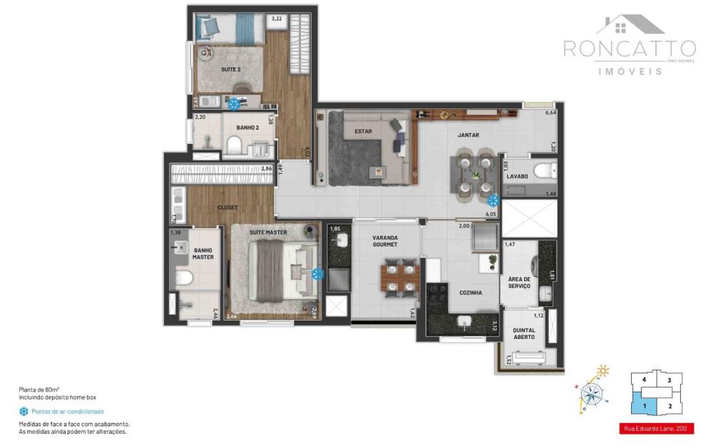 Entrega em Março de 2024 80m² com depósito home box, sendo 77,40m² do apartamento + 2,60m² do depósito 2 suítes mais lavabo 2 vagas determinadas